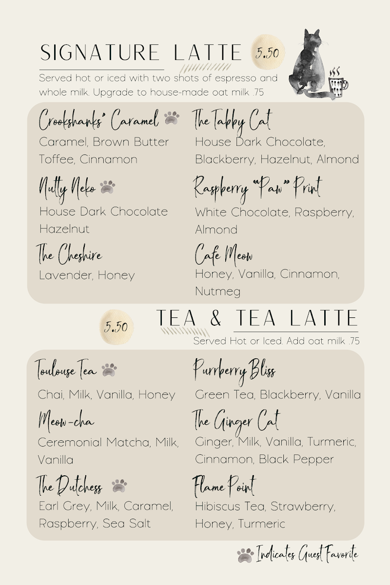 For tea enthusiasts, our Tea & Tea Lattes are crafted to perfection, featuring the aromatic Meowcha and invigorating Purrberry Bliss. The combination of flavors is nothing short of enchanting. Additionally, our House Specialties like the Hibiscus Meowjito and Minted Meowcha offer a unique twist that is sure to impress.