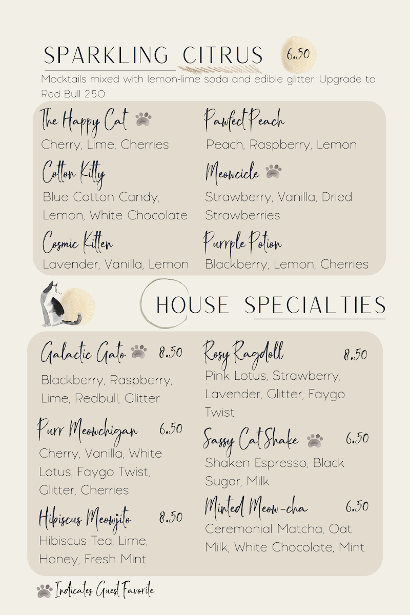 Welcome to Happy Cat Cafe, a delightful haven located at 447 Division Ave S in Grand Rapids, MI. Here, feline lovers can indulge in a menu that tantalizes the taste buds while celebrating the cuteness of cats. Our offerings include an exciting array of Sparkling Citrus Refreshers, such as the Pawfect Peach and Purrple Potion, perfect for a refreshing sip on a sunny day.
